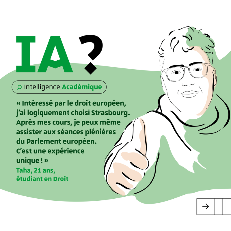 « Intéressé par le droit européen, j’ai logiquement choisi Strasbourg. Après mes cours, je peux même assister aux séances plénières du Parlement européen. C’est une expérience unique ! ». Comme Taha, étudiant en Droit, tous les étudiants de l'Université de Strasbourg évoluent dans un environnement à la pointe de la recherche et de la construction des savoirs. IA comme Intelligence Académique.
