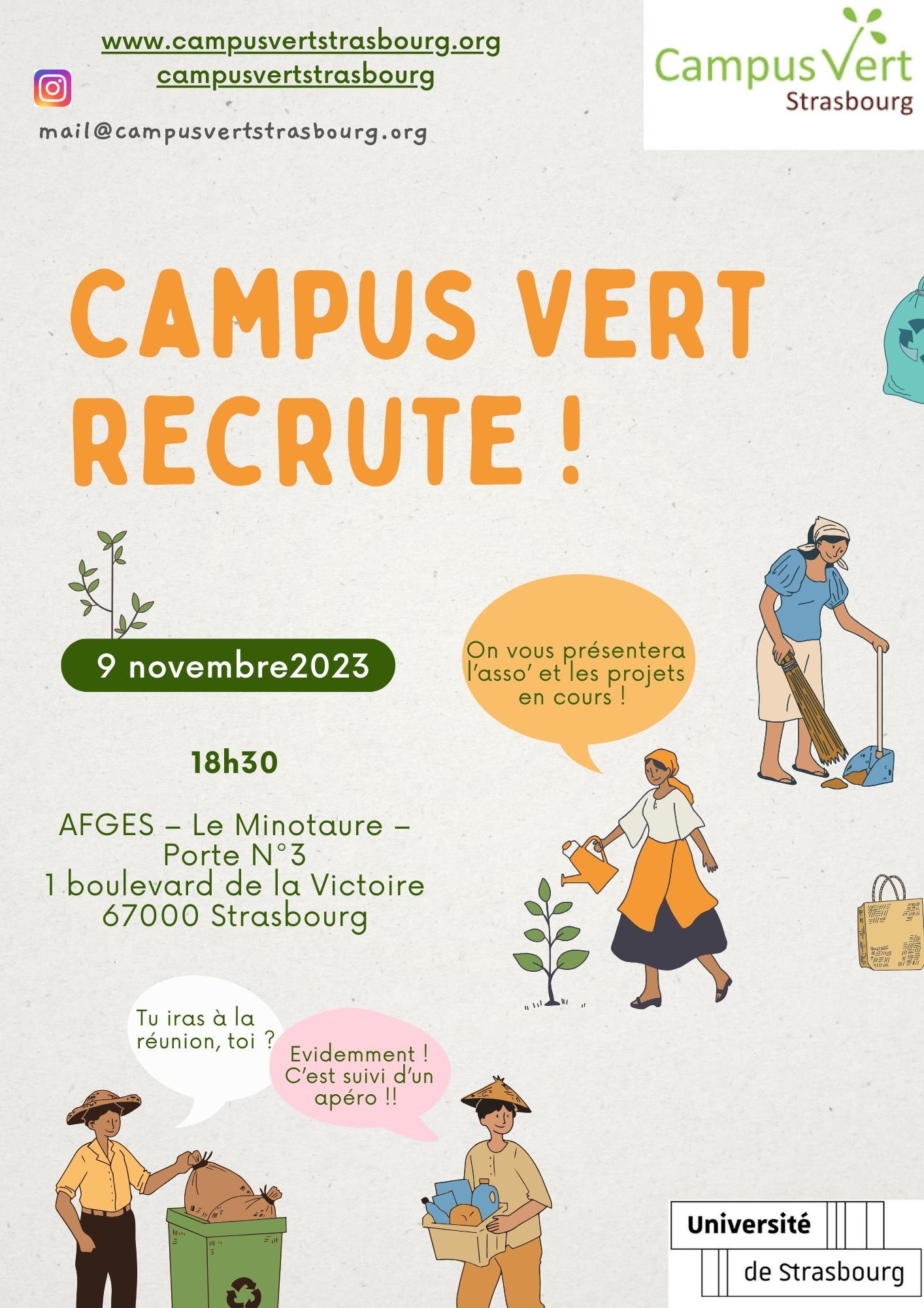 Campus Vert fait sa rentrée jeudi 9 novembre à partir de 18h30 à l'AFGES ! Nous sommes une association étudiante écologique apolitique présente depuis 2007 à Strasbourg.